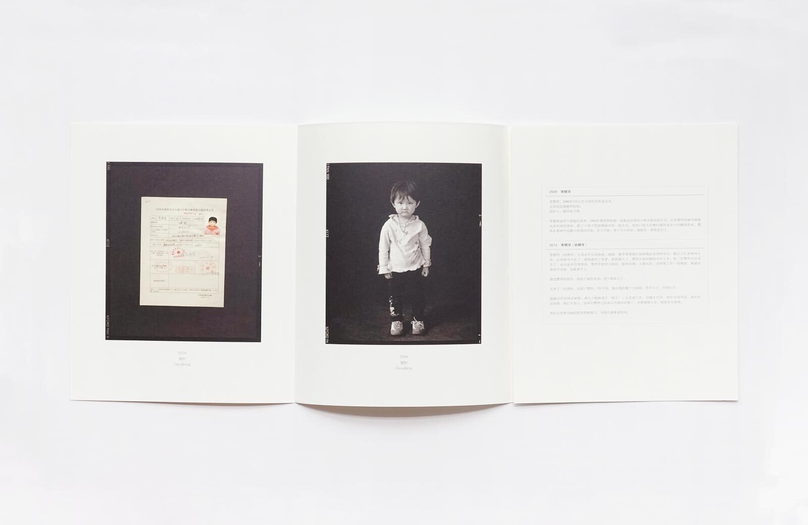 The artist portrayed 1000 parentless children who were taken care of by a community of Shaolin monks. Formally, the pictures are separated into two. The right, black and white side shows the foster children in front of a pitch black and empty background which emphasizes their feeling of being lost and isolation. In contrast to this, there are color photographs of official identity cards of each child.