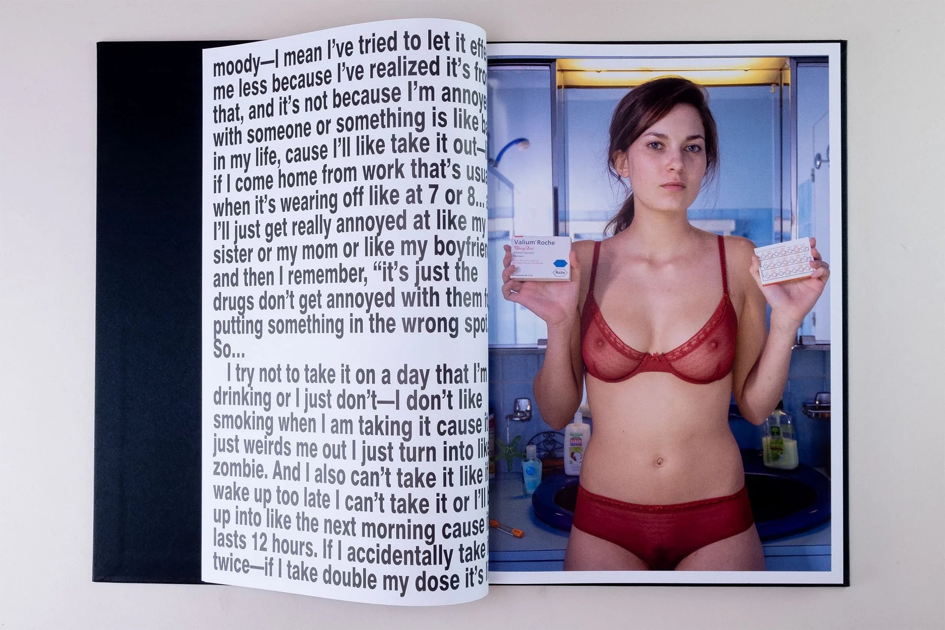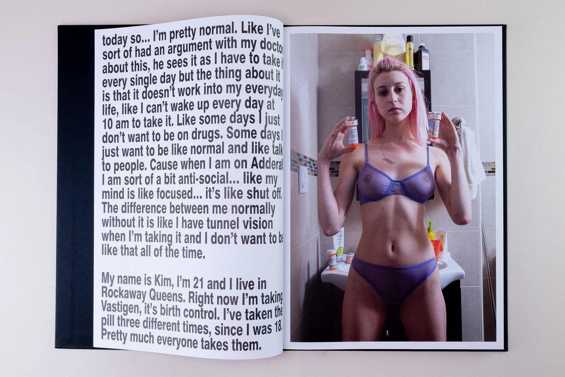 In this new work, Richard Kern photographed young women in the privacy of their bathrooms, posing unclothed with the medication they take daily. Each portrait is accompanied by the young model's account of her medical treatment.